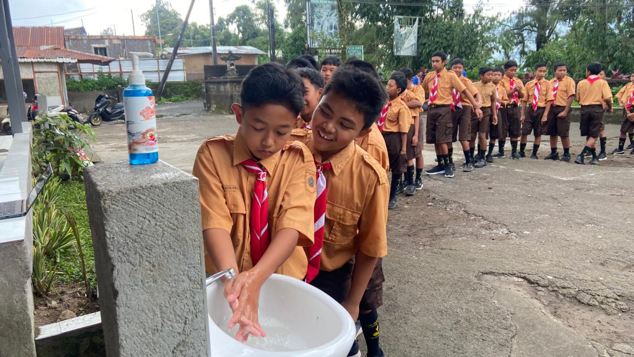 siswa membiasakan diri mencuci tangan dengan sabun sebelum memasuki kelas