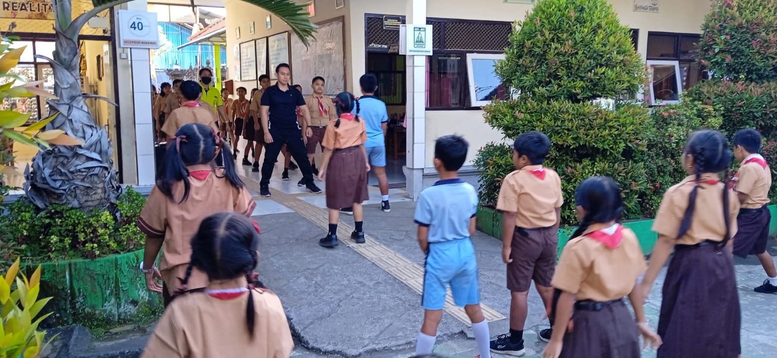ada, guru olahraga sedang melaksanakan senam bersama