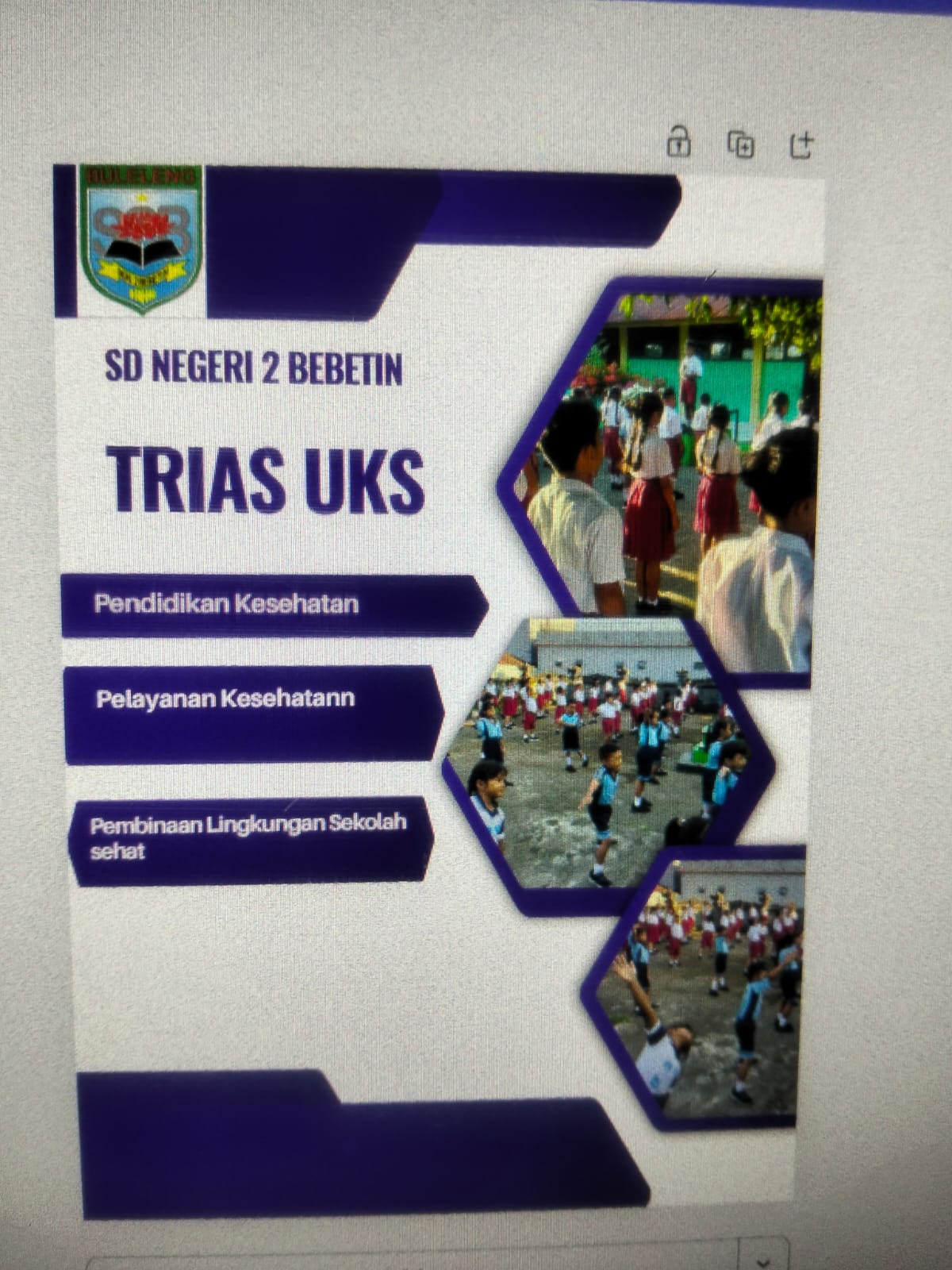 | 65 | Pembinaan Lingkungan Sekolah Sehat | Adanya Tempat Cuci Tangan Dengan Air Mengalir Dan Sabun Di Depan Gerbang Sekolah | Belum Dijawab |