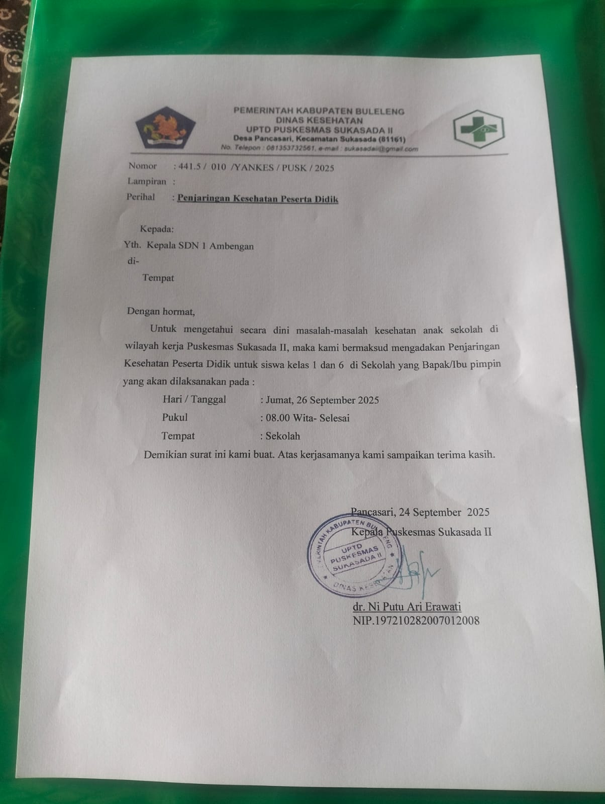 10 | Pelayanan Kesehatan | Pencatatan Hasil Pemeriksaan Kesehatan Siswa Pada Buku KMS/IMT | Belum Dijawab |